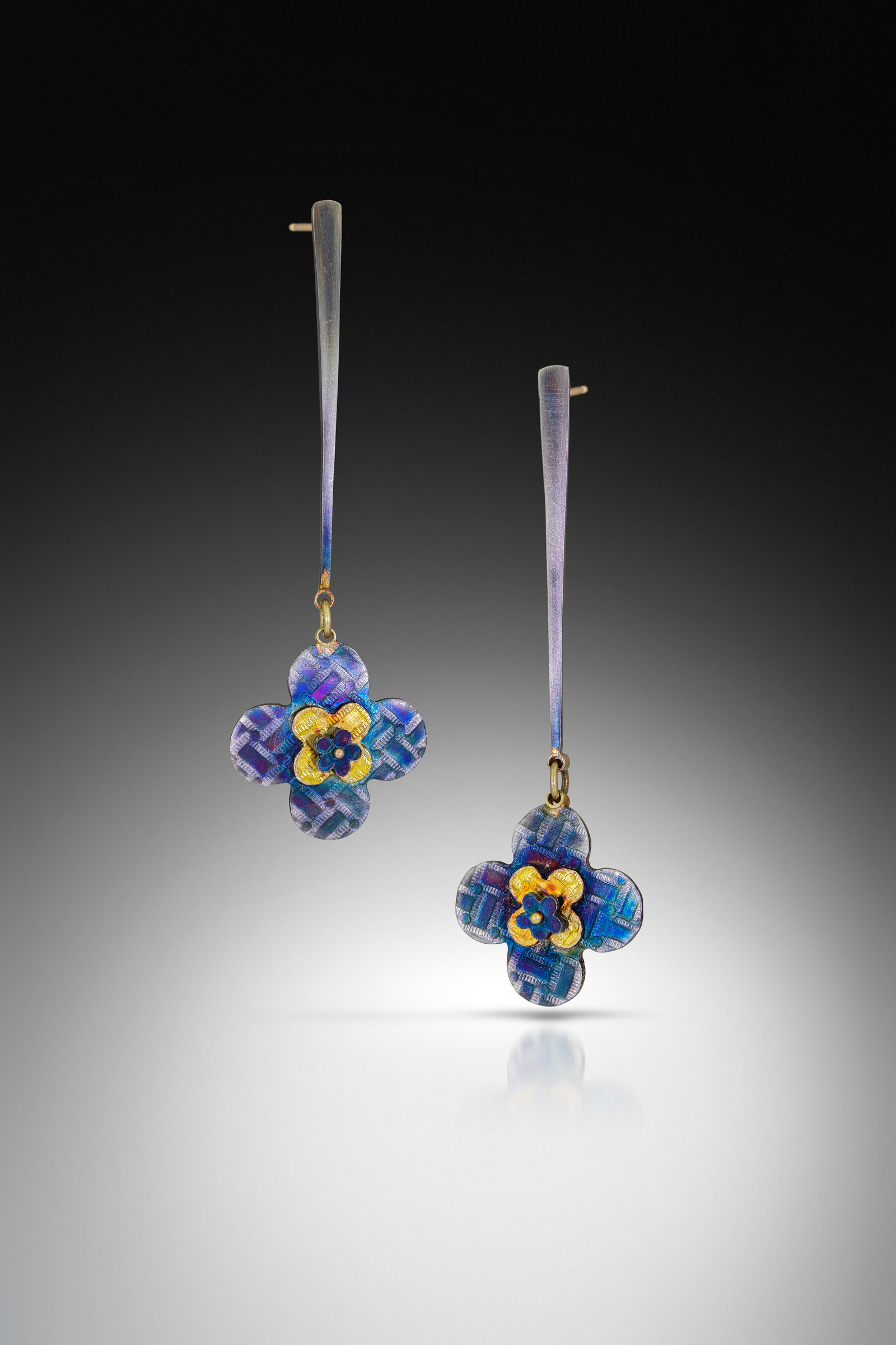 These stud dangle earrings feature hand-forged tapered drops with layered quatrefoil dangles and a spinning daisy center. The tapered drops are sterling silver with 18k connections and 14k posts. The layered quatefoil drops are made with embossed fine silver, 18k bimetal, and an 18k rivet center that allows the fine silver accent flower to spin freely. Multi-hued patina finish.